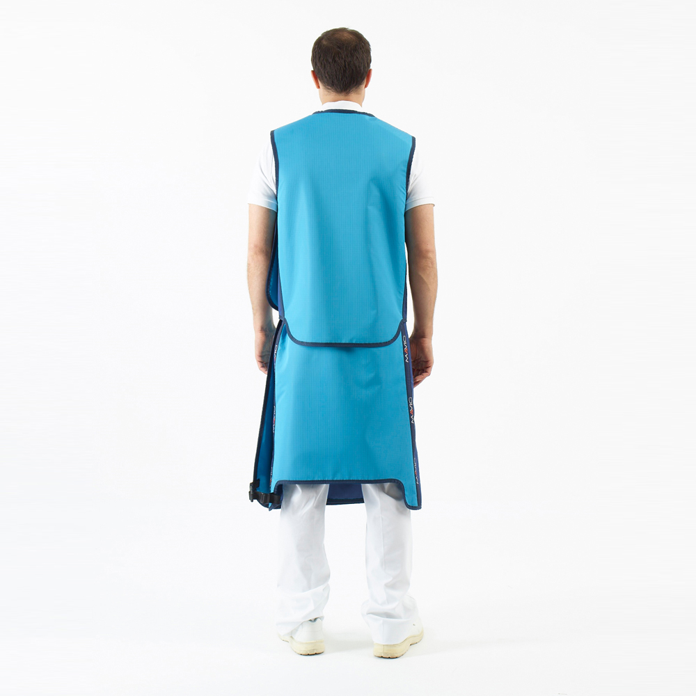 The integrated, colour-contrast safety zones (ocean) guarantee ideal X-ray protection. They will give you the certainty of being optimally protected in all situations. In the side area, the vest and skirt each have an ample 12 cm wide double layer with the full lead equivalent. This is also the case in the sections of the shoulder area where the cut is designed as non-overlapping. If the end of the front panel is within this clearly recognizable zone after putting on the protective clothing, you are covering the full 60% of the body circumference with the maximum protective value.